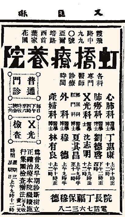 虹桥疗养院在1938年5月25日的《文汇报》上刊登的广告。 资料图片