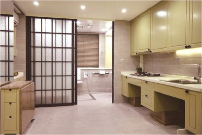 改造后的卫生间采用移门,方便轮椅进出。 -