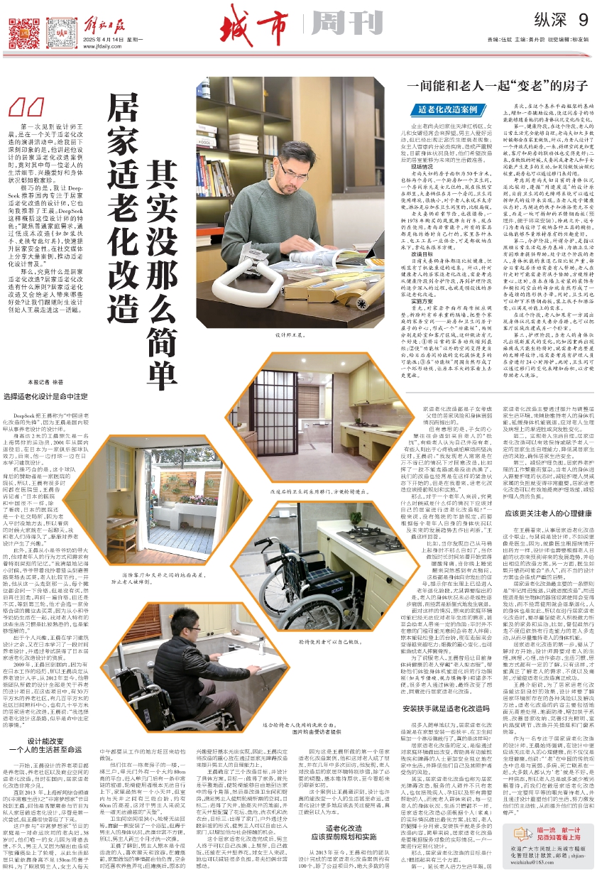 很巧的是,我让Deep Seek推荐国内专注于居家适老化改造的设计师,它也向我推荐了王晨。DeepSeek这样概括这位设计师的特色:“聚焦普通家庭需求,通过低成本改造(如加装扶手、更换智能灯具),快速提升居家安全性。在社交媒体上分享大量案例,推动适老化设计普及。”