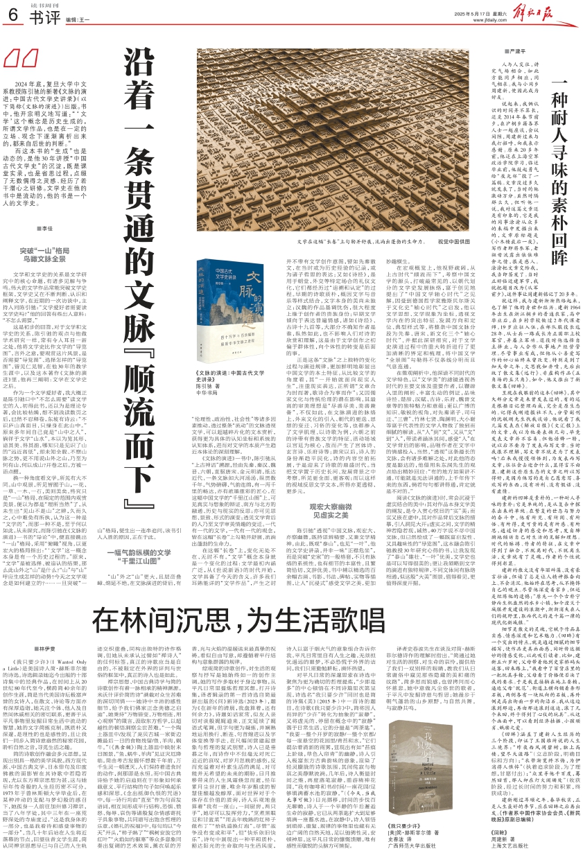 在微观阐析中,他深谙不同时代的文学特色,以“文学美”的滤镜透视各时代的主要文体及重要作者,以鞭辟入里的阐析、丰富生动的例证,品味诗经、楚辞、汉赋、古诗、乐府、魏晋文章等的独特魅力和意蕴;更以广博的知识、敏锐的视角,对先秦诸子、司马迁、“三曹”、竹林七贤、陶渊明、大小谢等富于代表性的文学人物做了独到而细腻的解读。从“人”到“文”、又从“文”到“人”,带读者涵泳其间,感受“人”在文学背后的影响,品咂作者在文字中的情感投入。当然,“透视”这条漫长的文脉,会有诸多难解之处,对此他的态度是豁达的,他借用朱东润先生的观点给出精妙回应:“有的地方如果讲不通,可能就是无法讲通的,上千年传下来的东西,倘若句句都讲得通,肯定就是不对的。”