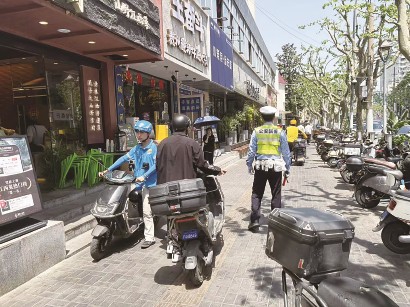 如何让外卖车辆慢下来、停下来,是消除隐患和冲突的关键。“处理这个问题,一定要疏堵结合,要充分考虑骑手的需求。”借鉴交通大整治以来的管理经验,静安公安交管部门决定在北京西路启用“P+W”(集中停车+短途步行取送餐)模式——在人行道划定专门的外卖车辆停放区域,安排人员做好管理,引导外卖骑手停车后,步行到商家取餐。