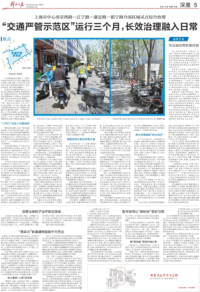 在静安公安分局交管支队勤务路设大队大队长张稳看来,“交通严管示范区”的设立,不止于严格执法管理这一层面,“更要从中积累经验,寻找解决问题的方法,让‘管理’变‘治理’,形成长效常态”——这也被视作破解超大城市交通难题的关键。