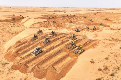 近日,内蒙古鄂尔多斯市达拉特旗境内的巴蒲线实现全线贯通。这条崭新的柏油公路横亘在库布其沙漠腹地,道路两边,工人们有序推进治沙工程作业,切割沙柳条、栽植立式网格沙障,工程机械推平沙丘,以备光伏装机。