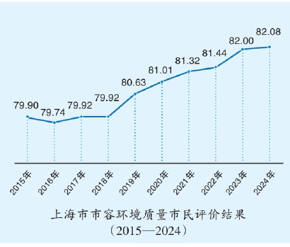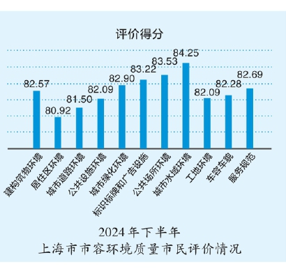 2024年下半年,上海市容环境质量市民综合评价为82.30分,较2024年上半年的81.85分略有上升,为良好水平。