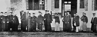 1922年,复旦大学江湾校舍落成,来宾参观校园。最右侧为李登辉校长。 照片由复旦档案馆提供 -
