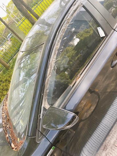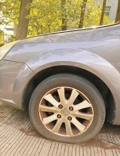 部分车辆看起来是长期停放状态。一辆深色小轿车车身落满尘土,前车窗上堆着枯叶,车胎已扁塌,车窗边缘缠有胶带;另一辆灰色私家车的轮毂表面呈锈蚀状,车胎已经漏气,类似车况的车辆有近10辆。这些车往往“混迹”于日常通勤车辆之间,外观低调、不易被察觉,但却长期占据着本就紧张的车位资源。