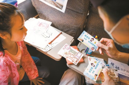 上海客运段高铁一车队为小朋友准备彩绘、蜡笔和贴纸等“哄娃神器”。 本报记者 海沙尔 摄 -