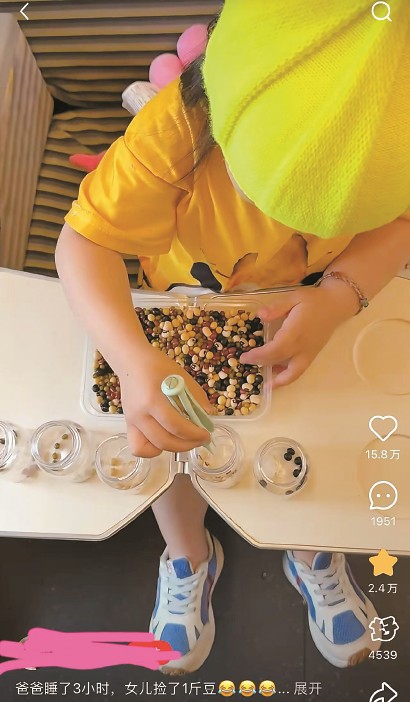 高铁上一位父亲让女娃拣豆。手机截屏