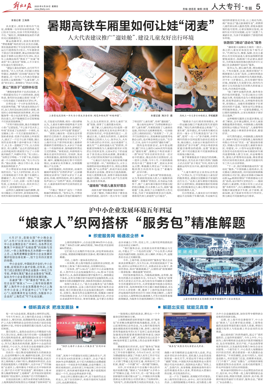“建设儿童友好城市,出行环节不容忽视。”市人大代表、市妇联主席张华建议,铁路部门应加强“适幼化”服务建设。另一位市人大代表白雪建议在高铁上设置和推广“儿童车厢”,打造“家长安心、乘客舒心”的出行环境。
