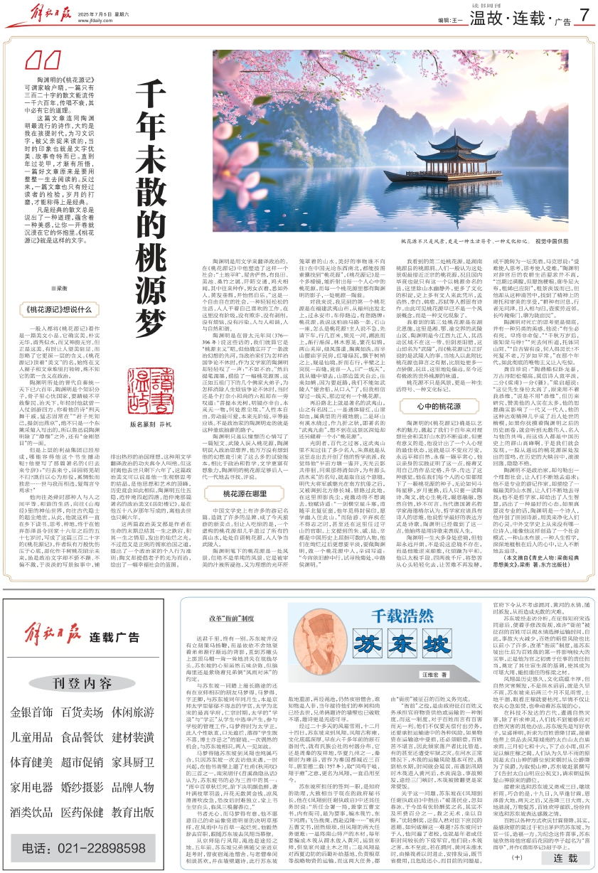 陶渊明笔下的桃花源是一处风景,但绝不是单纯的风景,它是被审美的汁液所浸泡,又为理想的光环所笼罩着的山水。美好的事物谁不向往?在中国无论东西南北,都能按图索骥找到“桃花源”。《桃花源记》是一个多棱镜,能折射出每一个人心中的桃花源,而每一个桃花源里都有陶渊明的影子,一处桃源一陶翁。