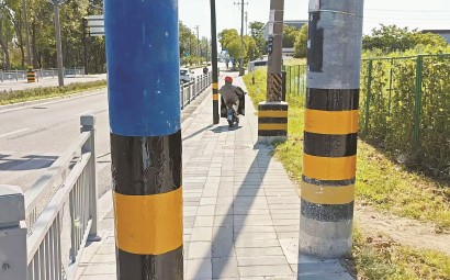 7月1日,记者来到金玉路梅园埭路交叉口,向西望去,由东向西方向的非机动车道与人行道合并,为砖石路面,由于是路口,非机动车道上装了信号灯柱、通信线缆桩等4根粗壮的立柱,过马路的行人和非机动车只能从间隙穿插而过。