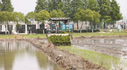 位于松江新浜的土是宝数字农场采用自动插秧。 资料图片 -