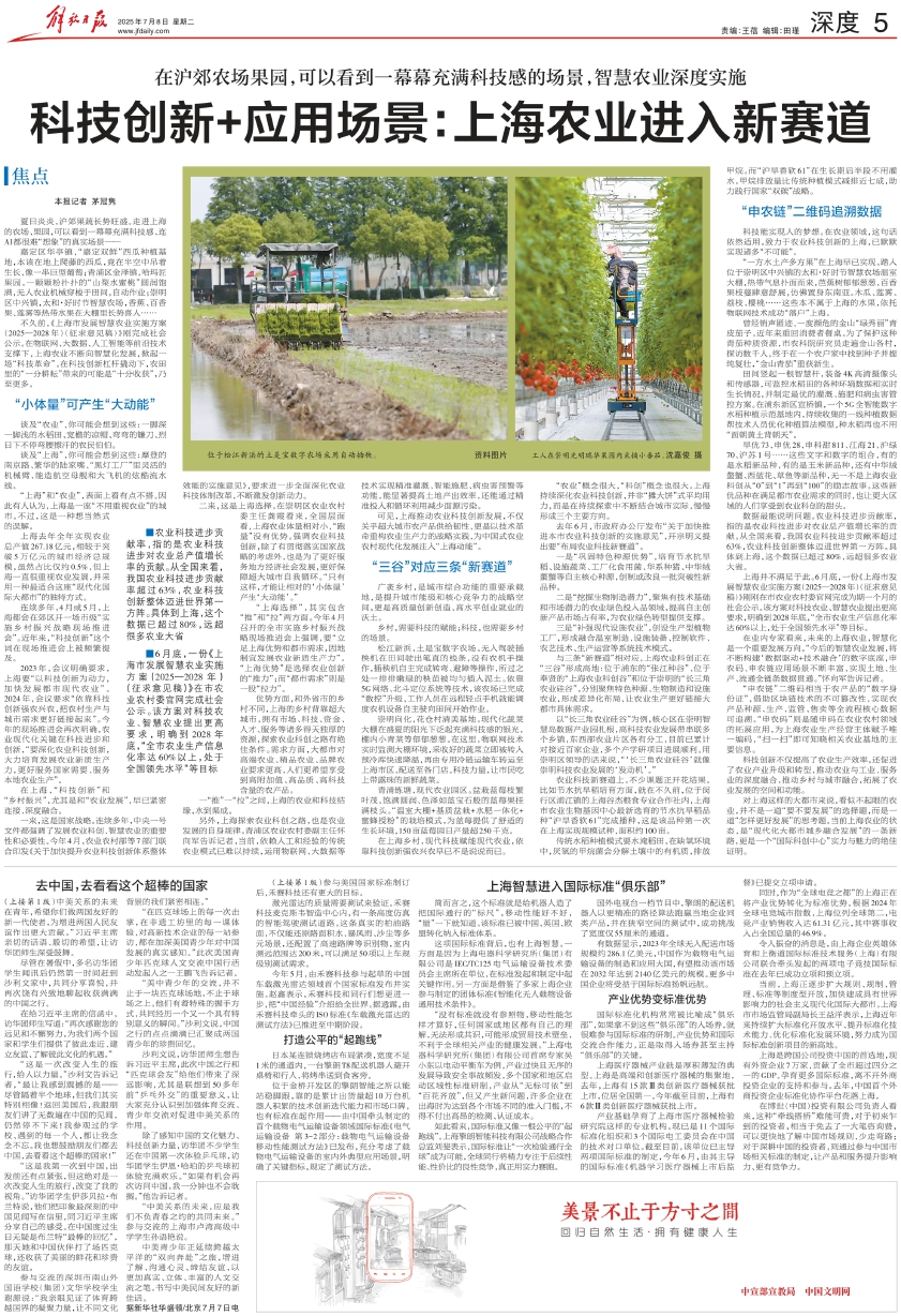 ■6月底,一份《上海市发展智慧农业实施方案(2025—2028年)(征求意见稿)》在市农业农村委官网完成社会公示。该方案对科技农业、智慧农业提出更高要求,明确到2028年底,“全市农业生产信息化率达60%以上,处于全国领先水平”等目标