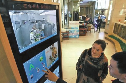 市民通过“明厨亮灶”显示屏,看到菜品从生到熟的全过程,消费得明明白白、吃得安安心心。 -