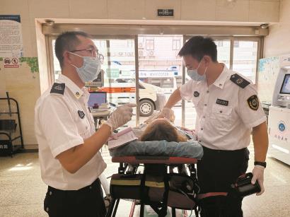 赶到现场时,只见伤员躺在地上,口面部有出血,但意识尚清晰。急救医生小心地为其固定头颈部抬上担架、开通静脉通道补充生理盐水、捡起现场掉落的随身物品,救护车迅速将伤员送至最近的医疗机构。“她现在不能说话,还好身上携带了证件,我们请她指纹解锁手机,帮忙联系家属尽快赶来。”张云龙说。