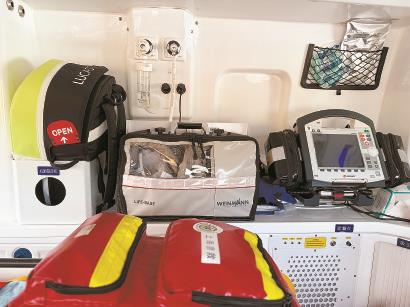 120车内配备心电监护、呼吸机等专业设备,红色急救包重达十几公斤。