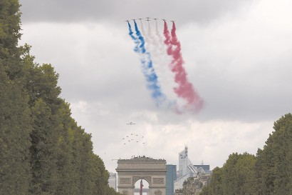 7月14日,“法兰西巡逻兵飞行表演队”参加在法国巴黎举行的国庆阅兵式。