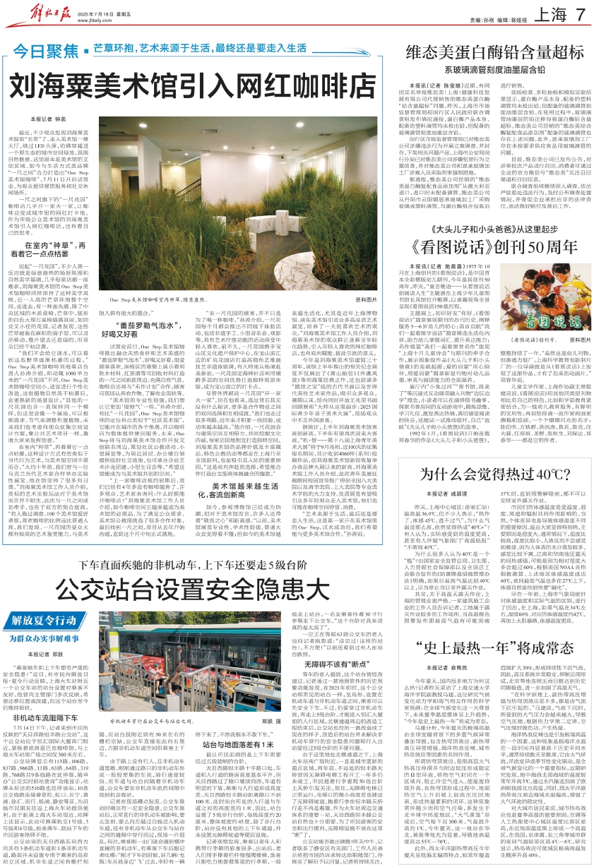 最近,不少观众发现刘海粟美术馆里“长草”了。走入美术馆一楼大厅,绕过LED大屏,仿佛穿越进一个原生态的城市空间绿地,氛围自然惬意。这里原本是美术馆的文创区域,如今与生活方式类品牌“一尺之间”合力打造出“One Step美术馆咖啡”,7月11日开启试营业,为观众提供餐饮服务和社交休闲场所。