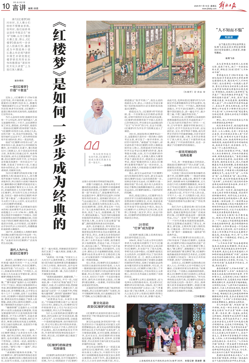 总而言之,《红楼梦》这部经典已经深入人心,在中国人心目中的地位无可撼动。正如著名作家白先勇所说:“如果说文学是一个民族心灵最深刻的投射,那么《红楼梦》在我们民族的心灵构成中,应该占有举足轻重的地位。”作为优秀传统文化的代表,《红楼梦》已经成为我们民族文化的一张名片。所以,我希望大家多多阅读《红楼梦》,喜爱《红楼梦》,支持红学事业的发展,为接续中华民族的文化根脉作出贡献。