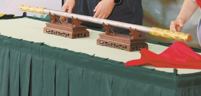 陨石文化展的一件重要展品是还原《西游记》记载、按原著描述打造的“纯陨铁金箍棒”。这根重13500克的“金箍棒”由棕色铁陨石制成。棒身采用苏州云纹精雕工艺,与维斯台登纹(一种存在于铁陨石中的特殊纹理)相得益彰。