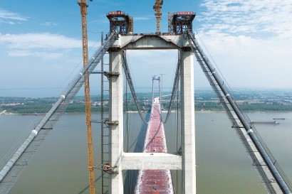 7月26日拍摄的合龙后的双柳长江大桥。当日,随着最后一片钢箱梁精准就位,由湖北交投集团投资建设,中铁大桥局、中交二航局参与施工的双柳长江大桥实现精准合龙,正式进入大桥附属工程施工阶段。