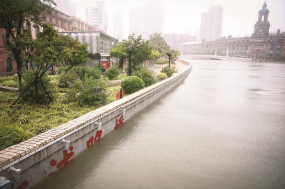 昨天,台风“竹节草”登陆上海,带来大暴雨。苏州河水位上涨,乍浦路桥桥名被淹一半。 本报记者 海沙尔 摄 -