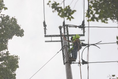 浦东一高压架空线因台风遭雷击断线,工人抓紧抢修。本报记者 赖鑫琳 摄 -