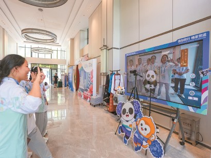 上图为在成都世运会运动员村A区中文学习互动体验区,志愿者在测试自拍互动相机。均新华社发