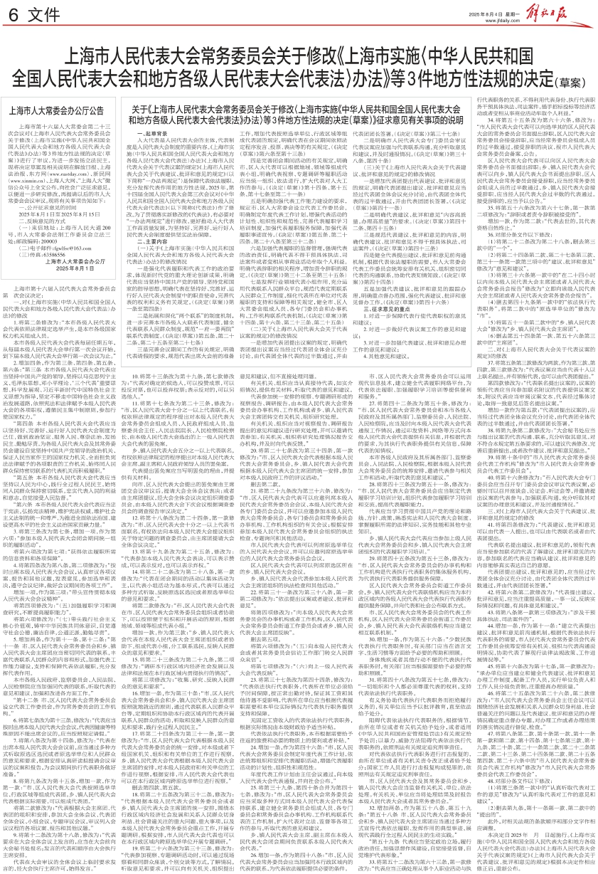 人大代表是人民代表大会的主体,代表制度是人民代表大会制度的重要内容。《上海市实施〈中华人民共和国全国人民代表大会和地方各级人民代表大会代表法〉办法》《上海市人民代表大会关于代表议案的规定》《上海市人民代表大会关于代表建议、批评和意见的规定》(以下简称“一办法两规定”)是保障代表依法履职、充分发挥代表作用的地方性法规。2025年,第十四届全国人民代表大会第三次会议对《中华人民共和国全国人民代表大会和地方各级人民代表大会代表法》(以下简称《代表法》)作了修改。为了贯彻落实新修改的《代表法》,有必要对“一办法两规定”进行修改,更好推动人大代表工作高质量发展,为坚持好、完善好、运行好人民代表大会制度提供坚实法治保障。