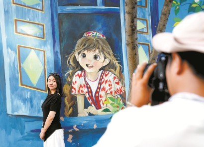 8月4日,在新疆伊犁哈萨克自治州伊宁市六星街,游客在一处涂鸦墙前留影。