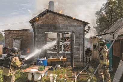当地时间8月9日,乌克兰康斯坦丁尼夫卡,俄罗斯炮击该市后乌克兰消防员正在灭火。 视觉中国 -