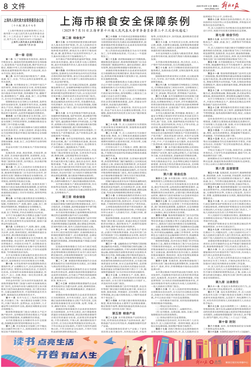《上海市粮食安全保障条例》已由上海市第十六届人民代表大会常务委员会第二十三次会议于2025年7月31日通过,现予公布,自2025年9月1日起施行。