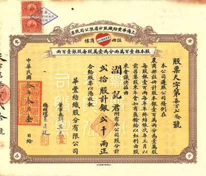 一张发行时间为1921年3月1日的华丰纺织股份有限公司的股票,引起了我的注意