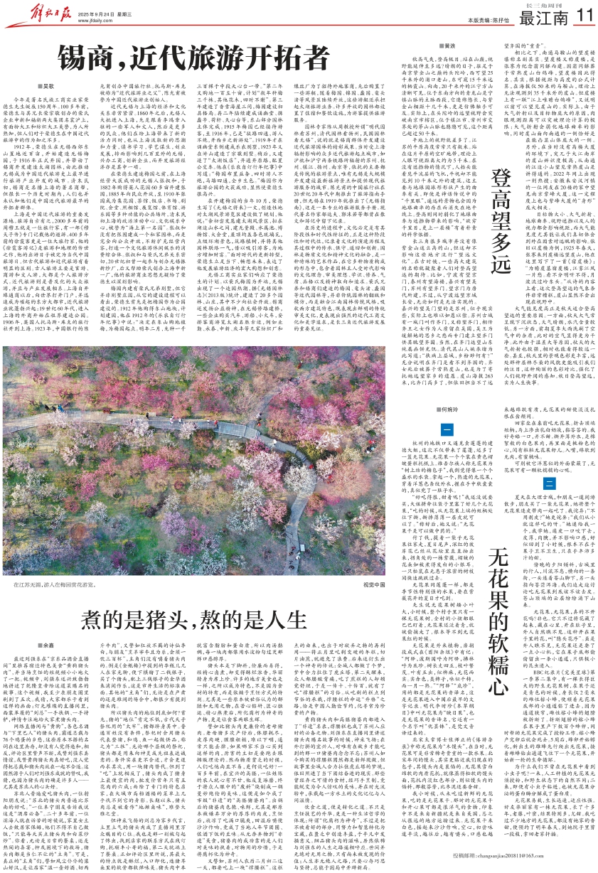 园林专家陈从周教授所谓“明代园林看苏州,清代园林看扬州,民国园林看无锡”,说的就是锡商群体开发建设近代旅游园林的精彩成果。当时受上海辐射影响的众多近代旅游起点城市,如沪杭和沪宁两条铁路所辐射的苏州、杭州、镇江、扬州、南京等,依托的主要都是传统的旅游景点,唯有无锡是大规模开发建设最新旅游景点和提供现代旅游服务的城市。陈光甫的中国旅行社在20世纪20年代中期推出了旅游指南手册,但无锡在1919年就推出了《无锡指南》,这是一本专业的旅游服务手册。现代著名作家郁达夫、郭沫若等都曾在散文和游记中留下记录。