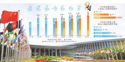 进博会持续“上新”,赋能上海进口商品“大码头”愈发出彩。在已经成功举办的7届进博会中,上海交易团采购成交额累计562亿美元。2024年,上海实现进口总额2.45万亿元,比2017年进口总额增长28%。 下转 9版(上接第1版)今年1—9月,上海进口同比增长1.1%。在消费品进口方面,上海口岸化妆品、葡萄酒、箱包、钟表、药材和药品等进口额占全国同类商品进口的40%以上。