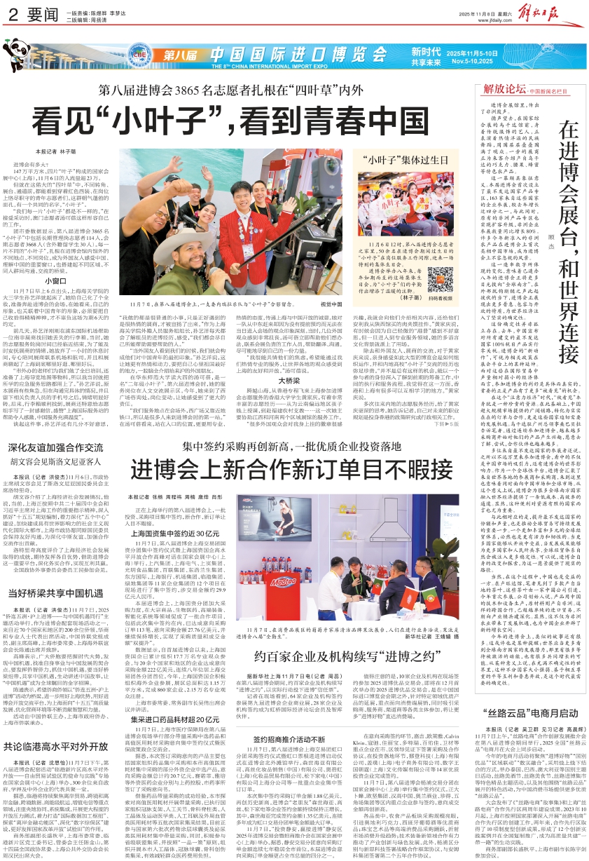 团市委数据显示,第八届进博会3865名“小叶子”中包括长期管理岗志愿者114人,会期志愿者3668人(含外籍留学生30人)。每一片不同的“小叶子”,扎根在进博会馆内馆外的不同地点、不同岗位,成为外国友人感受中国、理解中国的重要窗口,也搭建起不同区域、不同人群间沟通、交流的桥梁。