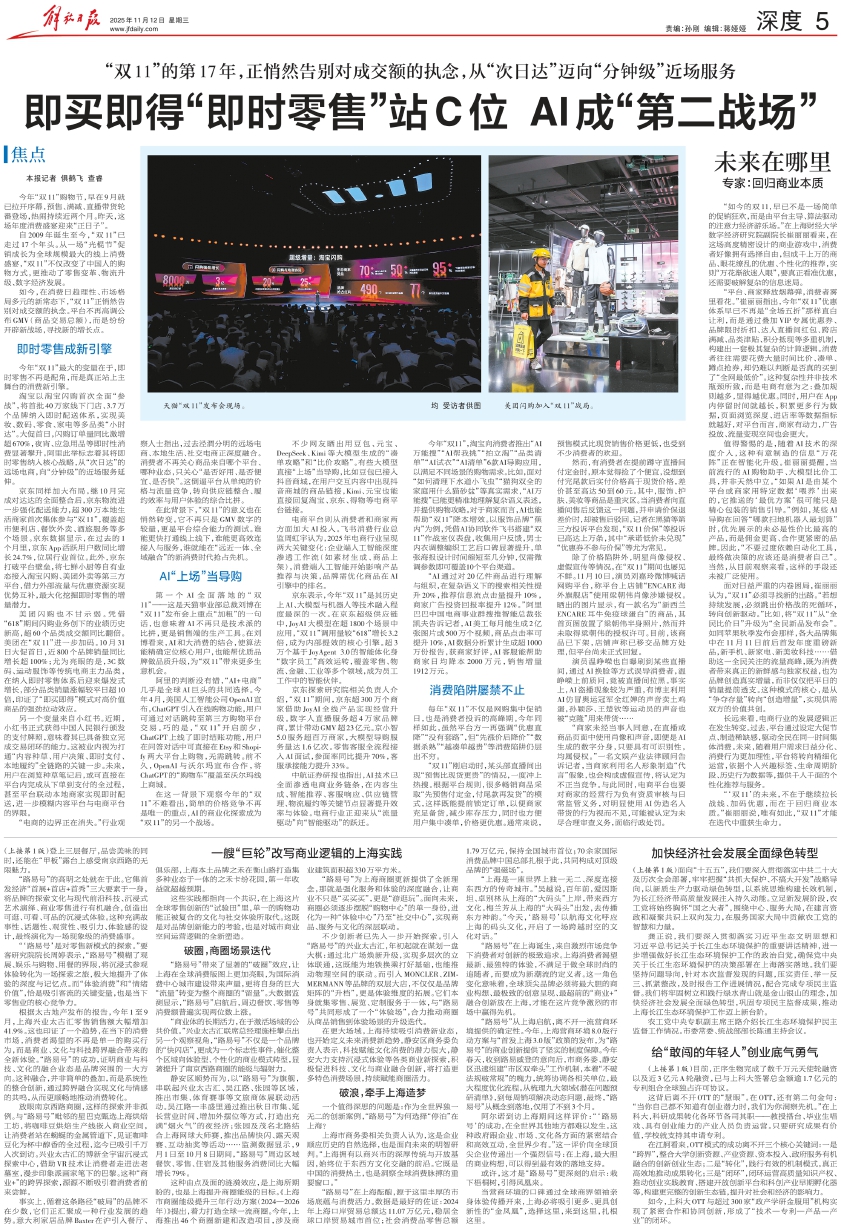 今年“双11”,淘宝向消费者推出“AI万能搜”“AI帮我挑”“拍立淘”“品类清单”“AI试衣”“AI清单”6款AI导购应用,以满足不同场景的购物需求。比如,面对“如何清理下水道小飞虫”“猫狗双全的家庭用什么猫砂盆”等真实需求,“AI万能搜”已能更精准地理解复杂语义表述,并提供购物攻略。对于商家而言,AI也能帮助“双11”降本增效。以服饰品牌“蕉内”为例,凭借AI协同软件飞书搭建“双11”作战室仪表盘,收集用户反馈,男士内衣调整编织工艺后口碑显著提升,单张海报设计时间缩短至几分钟,仅需微调参数即可覆盖10个平台渠道。