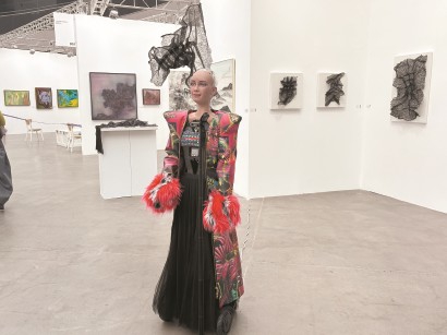 艺术与科技的融合成为一大亮点。在西岸穹顶艺术中心的“觀空间”展区,机器人Sophia身着亮粉色皮衣与黑长裙,逼真的皮肤纹理和身体细节,吸引大量观众驻足。现场工作人员介绍,Sophia是艺术家洪慧的“好伙伴”。近年来,洪慧以其独特的“蕾丝书法”美学训练Sophia进行机器学习,开启人机共创的艺术实验。此次展出的作品《熟知的低语》,正是跨界合作的成果。