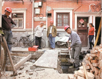 2018年4月,黄浦区老西门街道永业里,施工队在弄堂里改造排污管道。 -
