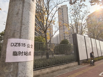 宝山区大华·公园城市逸翠华庭小区西门北侧的一根电线杆上,贴有“DZ515公交临时站点”的A4纸。保安称,早高峰时乘坐的居民不少。毛锦伟 摄 -