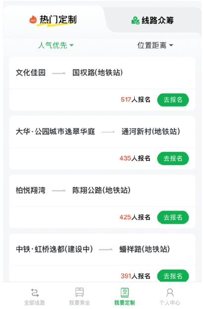 从文化佳园往返于国权路地铁站的定制线路是众筹热度第一名。手机截屏
