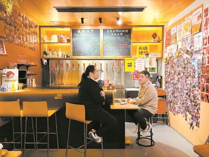 夏玉杰(右)和崔雅梦在小酒馆交流。 王海燕 摄 -