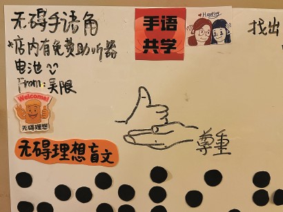 夏玉杰抛出问题后,外国朋友开始“寻宝”:入口处那扇加宽并带有扶手的可折叠侧开门最先被发现,它保障轮椅使用者单手开关门;有人指了指“吧台”,两个有高有低的吧台,轮椅伙伴也能舒适融入;有人发现,桌角全部磨圆了,以避免磕碰;有人注意到,台灯上星星点点的凸起是盲文标识;有人指着墙上的手语科普白板;一张盲文版布局图被发现,它为视障朋友勾勒出这方天地的完整轮廓;在门口,共享助听器的电池静候取用,以备不时之需——方寸之间,体贴无处不在。
