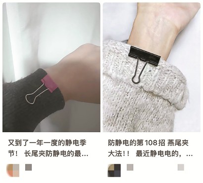 比如,很多网友会在衣服袖口、裤脚边夹一个金属长尾夹;还有网友把金属回形针穿成串,从裤边挂到地上,好像一根“地线”。这些做法都是通过导电性更强的金属将人体积累的电荷转移掉,所以防静电作用明显。