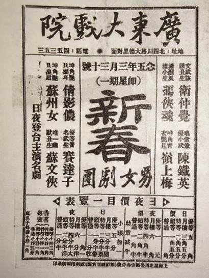 1928年,原广舞台负责人招股筹资,由旅沪潮州人、珠宝商吴朝和租地投资建造,李耀东、武生原经办,在四川北路1552号开工建设建筑面积达1765平方米、钢筋混凝土框架结构高四层、场内分为正厅和楼厅(扇形)的广东大戏院。1931年1月大戏院开业时,由广东新春秋粤剧团首演。从保存下来的节目单可见,演出阵容强大,还预告了白驹荣首本粤剧名剧《佳婿是孩儿》《客途秋恨》,吸引了众多旅沪广东籍人士捧场。