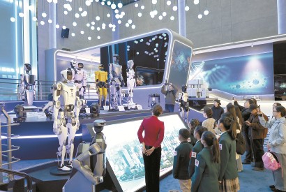 昨天,参观者在浦东开发开放主题展机器人展区前驻足观看。 新华社记者 方喆 摄