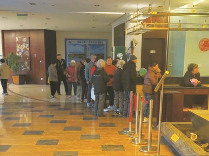基地酒店内,老人正排队等开餐。 车佳楠 摄 -