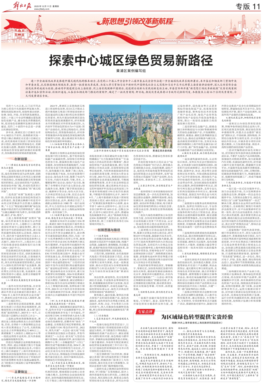 进一步全面深化改革是推进中国式现代化的根本动力。在党的二十届三中全会和十二届市委五次全会作出进一步全面深化改革系统部署后,本市各区和相关部门贯彻中央和市委决策,扎实推进相关领域改革,取得一批重要改革成果。为深入学习贯彻习近平新时代中国特色社会主义思想和习近平总书记考察上海重要讲话精神,深入总结宣传全面深化改革的成效与经验,推动用中国道理总结上海经验、用上海实践阐释中国理论,促进理论创新与实践创新良性互动,市委宣传部开展“新思想引领改革新航程”优秀实践案例征集评选和宣传活动。经组织遴选,从各区和相关部门报送的案例中,确定了一批优秀案例。即日起,相关优秀成果将以专版形式陆续刊发。本报聚焦上海16个区的优秀案例,今天刊发黄浦区专版。