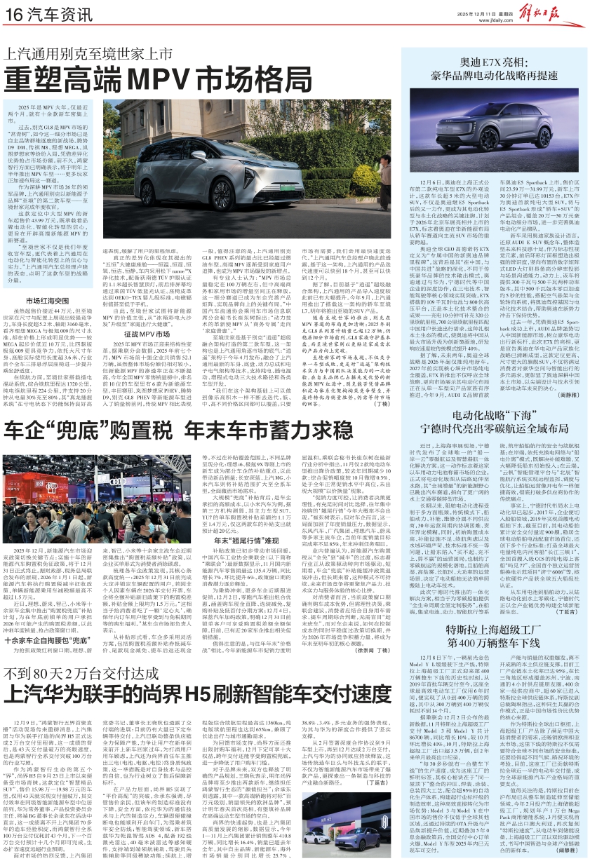 从2月签署深度合作协议到9月车型上市,再到12月达成2万台交付,上汽与华为的协同效应持续释放。这场传统造车巨头与科技龙头的联手,不仅为智能新能源汽车市场带来了爆款产品,更探索出一条制造与科技的产业融合新路径。 (丁延吉)