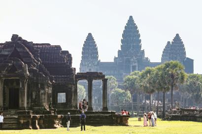 游客在柬埔寨暹粒吴哥古迹游览。